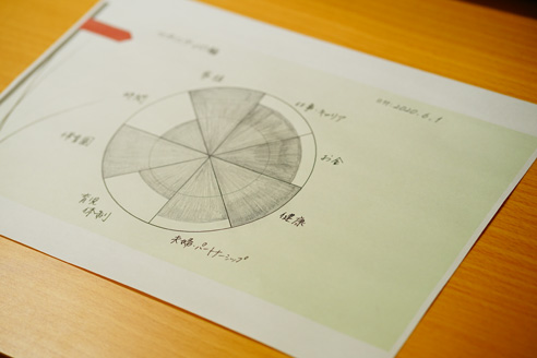 まず、大きな円を書いて8等分します。(ピザのようなイメージです。)それぞれのテーマ(悩みの領域)をその1枚分に割り振り、一つ一つのエリアがどんな状態なのか、そして全体ではどんな状況にあるのかに意識を向けていきます。